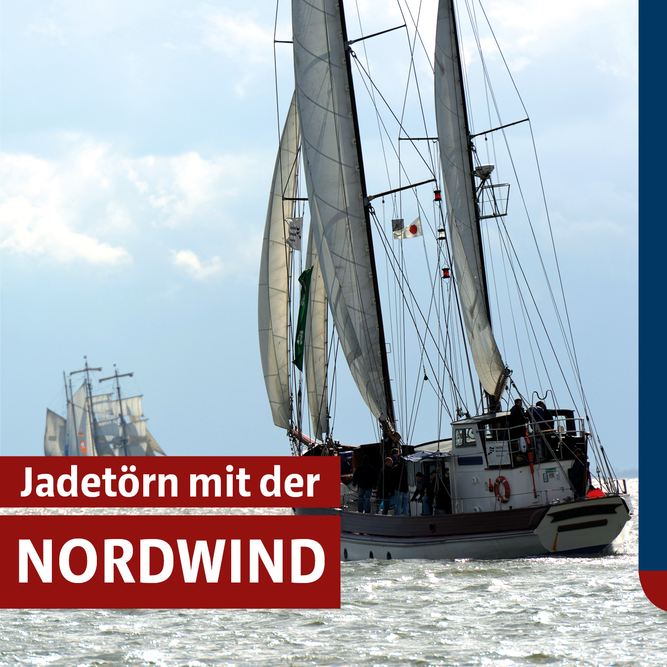 Schnuppern Sie Seeluft auf unserem Seemannschaftsschulboot NORDWIND und fahren Sie mit der Crew auf die Nordsee zum Marinehafen, dem JadeWeserPort und Schillig-Reede.